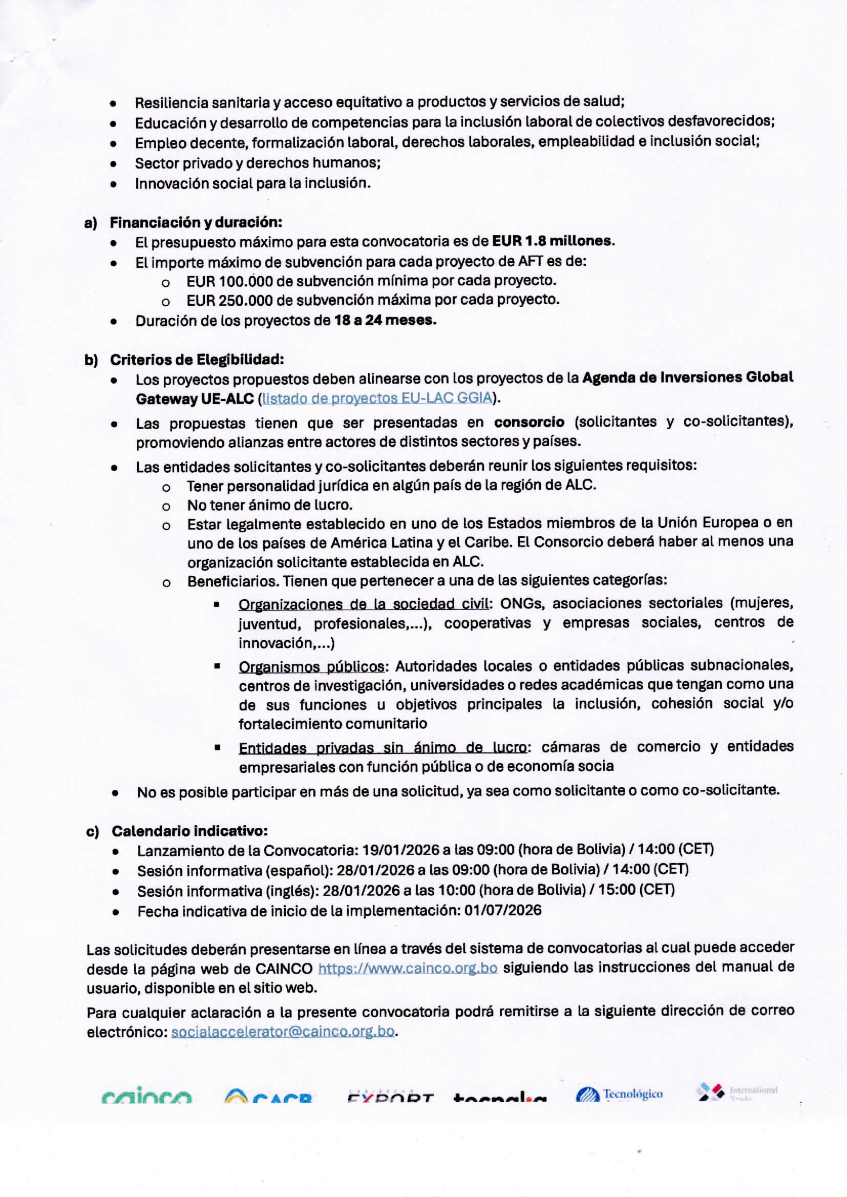 Mayor aclaración a la presente convocatoria, remitirse al email: socialaccelerator@cainco.org.bo