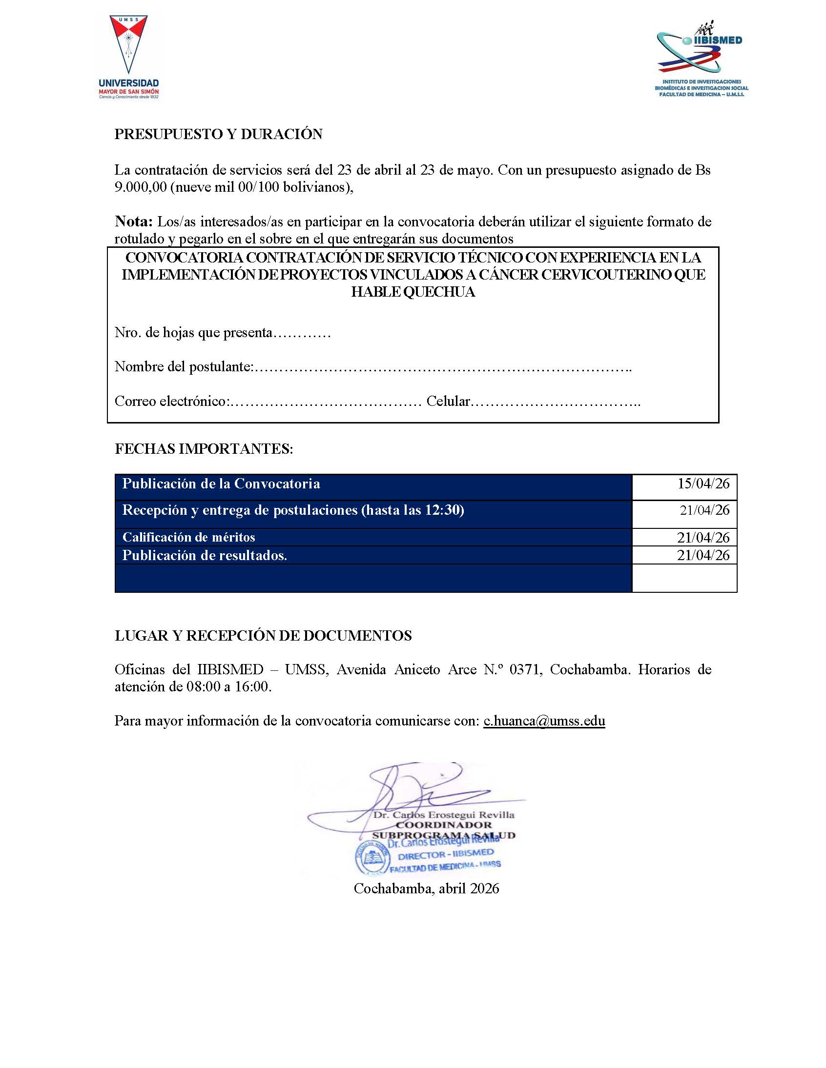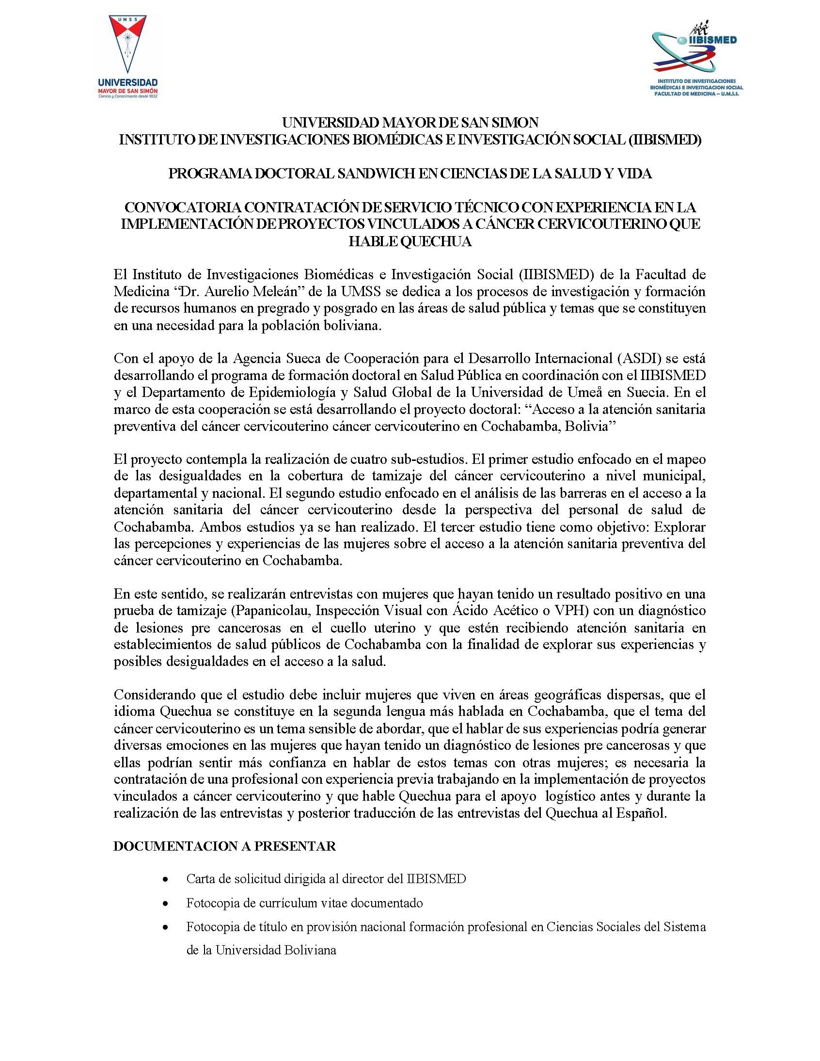 Convocatoria: Contratación de servicio técnico con experiencia en la implementación de proyectos vinculados a cáncer cervicouterino que hable Quechua