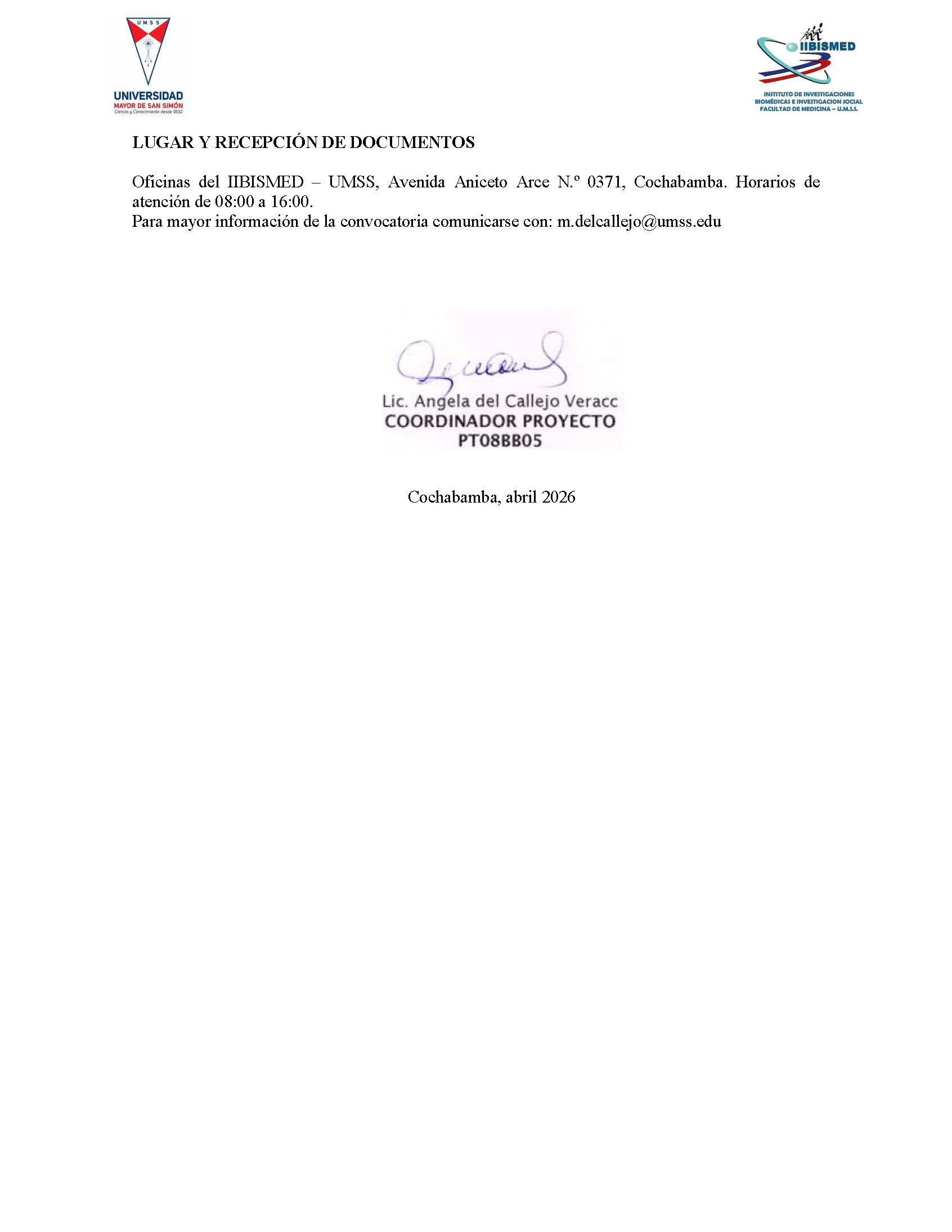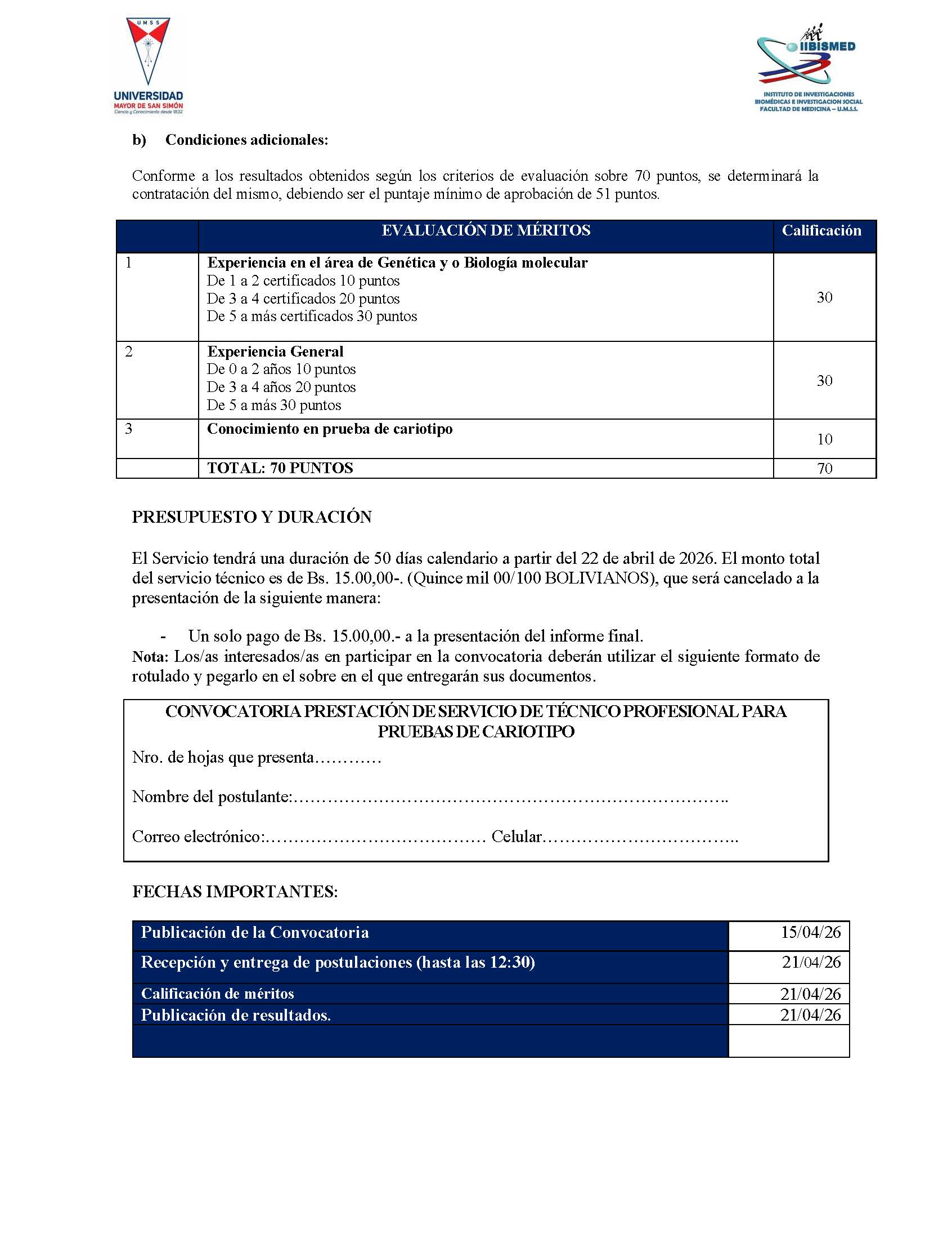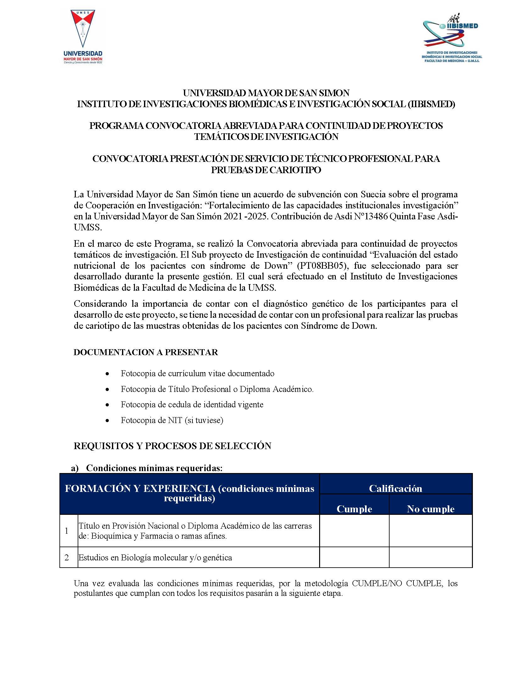 En el ámbito del FGSICTI-Proyecto “Prevalencia de alteraciones cromosómicas en pacientes pediátricos asociados a malformaciones congénitas atendidos en hospitales de la ciudad de Cochabamba”, se lanza la presente convocatoria.