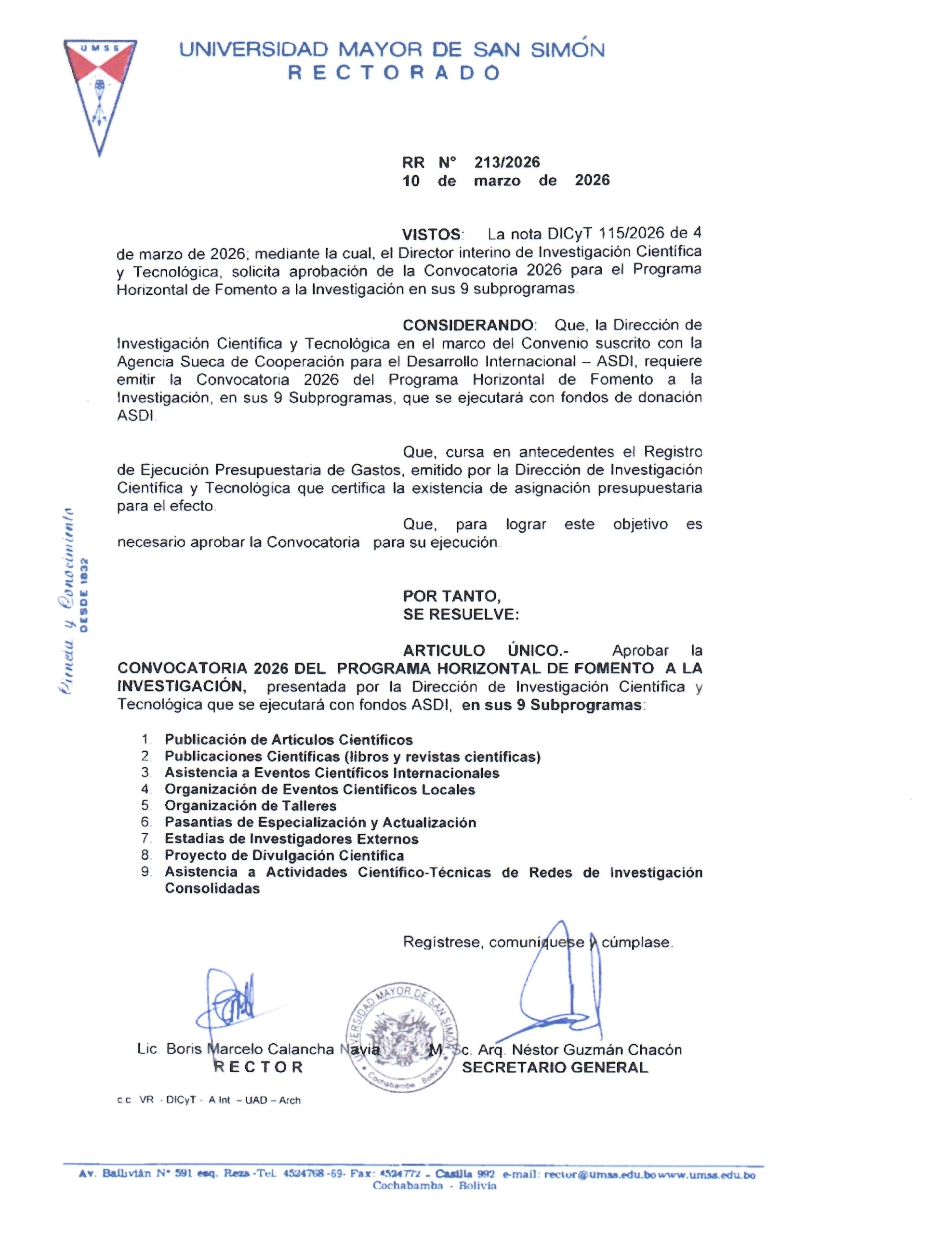 En este contexto, la Dirección de Investigación Científica y Tecnológica (DICyT), en cumplimiento del Acuerdo de Cooperación Asdi-UMSS y el Reglamento Interno del Programa Horizontal de la UMSS, hace pública la Convocatoria anual 2026 del Programa Horizontal de Fomento a la Investigación en sus 9 subprogramas de apoyo, aprobada mediante Resolución Rectoral N° 213/2026 de marzo de 2026, promoviendo criterios de equidad de género, inclusión y no discriminación en todas las etapas del proceso.