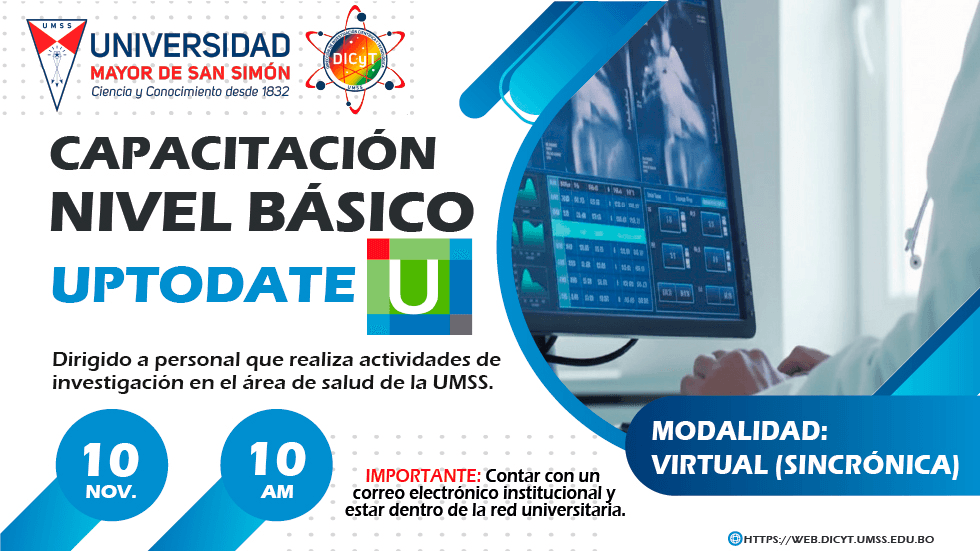 La Dirección de Investigación Científica y Tecnológica (DICyT) de la Universidad Mayor de San Simón (UMSS) se complace en anunciar la suscripción anual a UPTODATE, un sistema de soporte para la toma de decisiones clínicas basadas en la evidencia. Esta importante incorporación representa un avance significativo que fortalece la práctica profesional y el desarrollo de la investigación en el área de la salud.